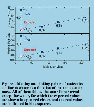 Let us look at an example of the surprising properties of water. The strangeness of water starts with the fact that it exists on Earth. Water, being composed of two fairly light atoms (hydrogen and oxygen), should be in the gas phase at the usual temperature ranges that exist in our world. In fact, all compounds that are close to it (i.e. H2S, H2Se, and H2Te) are found mostly in the gas phase. But, compared to similar substances, it melts about 100 degrees above the expected melting point and it boils about 150 degrees above the expected boiling point (see Figure 1). The result is that it is the only material that exists naturally in all three forms (i.e. as ice, liquid, and vapor) on Earth.