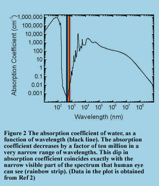 In Figure 2, the absorption coefficient of water is plotted as a function of wavelength (red line). The first thing you notice is that water has a very high absorption coefficient, except for a very narrow region around 500nm. In this small region of wavelength, the absorption coefficient is ten million times smaller than the neighboring regions. What is more interesting than this enormous drop in the absorption coefficient is that this dip happens exactly at the visible part of the spectrum. The human eye can only see wavelengths between 400-700 nm. This visible part of the spectrum is indicated by a rainbow colored strip in the graph. It is amazing that this exactly coincides with the region where water is transparent. Adding to this pleasant surprise is the fact that the amount of light emitted by the sun peaks around this dip as well.